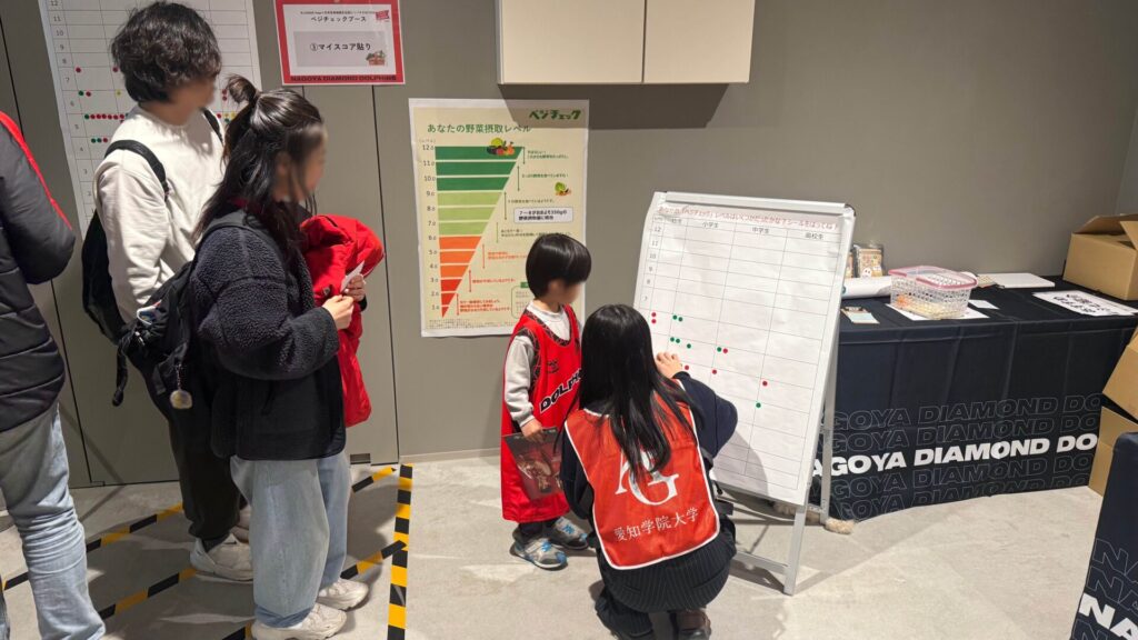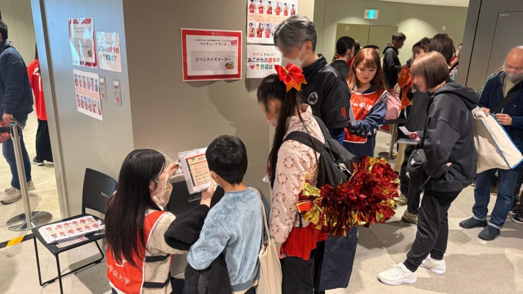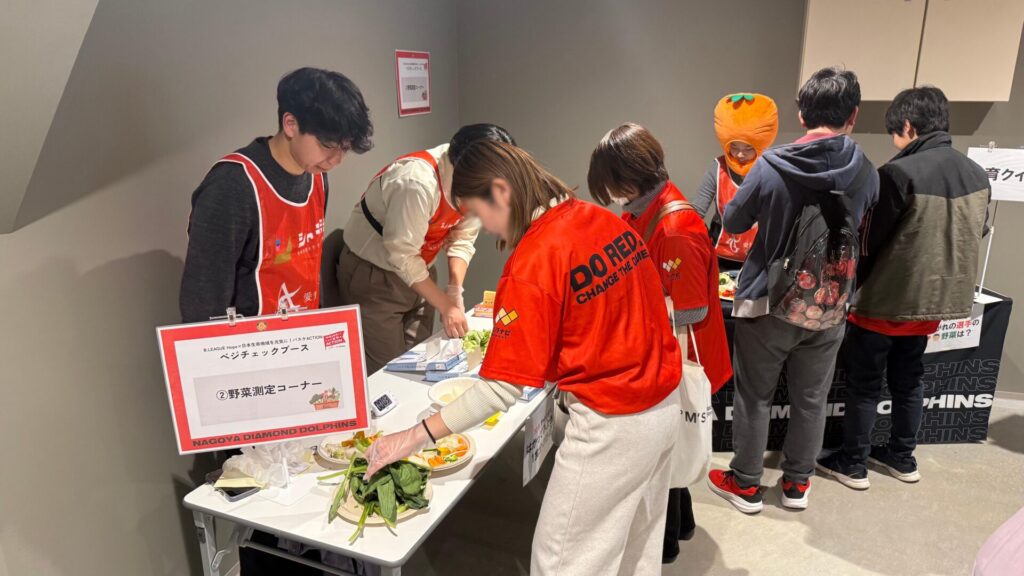 名古屋市のプロバスケットボールチーム・名古屋ダイヤモンドドルフィンズの試合会場であるIGアリーナの会場内ブースで、11〜13時の試合開始前までの時間に、健康栄養学科の栄養教育・スポーツ栄養に興味のある3年生の有志15名がベジチェックやクイズ、野菜計量体験を行いました。実施にあたり、野菜の摂取量増加をテーマとし、名古屋ダイヤモンドドルフィンズ・日本生命・本学学生の三者で意見を出し合いながら企画を進め、当日のブース実施に至りました。 愛知県民の野菜摂取量は、厚生労働省が推奨する1日あたりの目標量(350g)より少ない傾向にあります。そこで、来場者の皆さまに自身の食生活を見つめなおしていただく機会を提供しました。 ブースでは、手のひらをセンサーに当てるだけで野菜摂取量を推定できる「ベジチェック」を設置し、来場者の方々に体験していただきました。参加者は、自分の数値を確認しながら、日々の食生活を振り返る機会となりました。