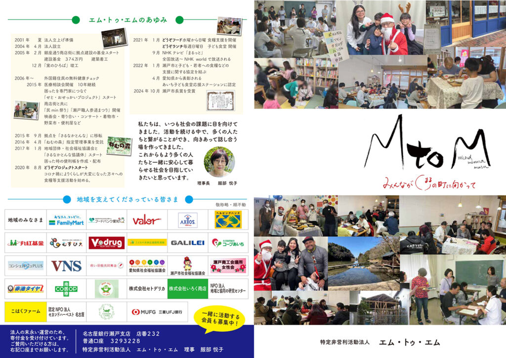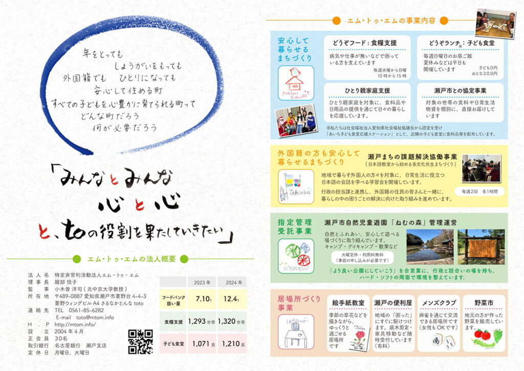 | エム・トゥ・エムとは? | 私たちは瀬戸市を中心に、自治体や子ども食堂ネットワーク、地元の学生、 社会福祉協議会などと連携し、誰もが心豊かに暮らせる地域づくりを目指して 2003年から活動しています。 地域に根差したさまざまな活動を通じて、人と人とのつながりを育み、 外国籍住民を含めて困っている人に手を差し伸べられる 「地域のプラットフォーム」としての役割を担っています。 |