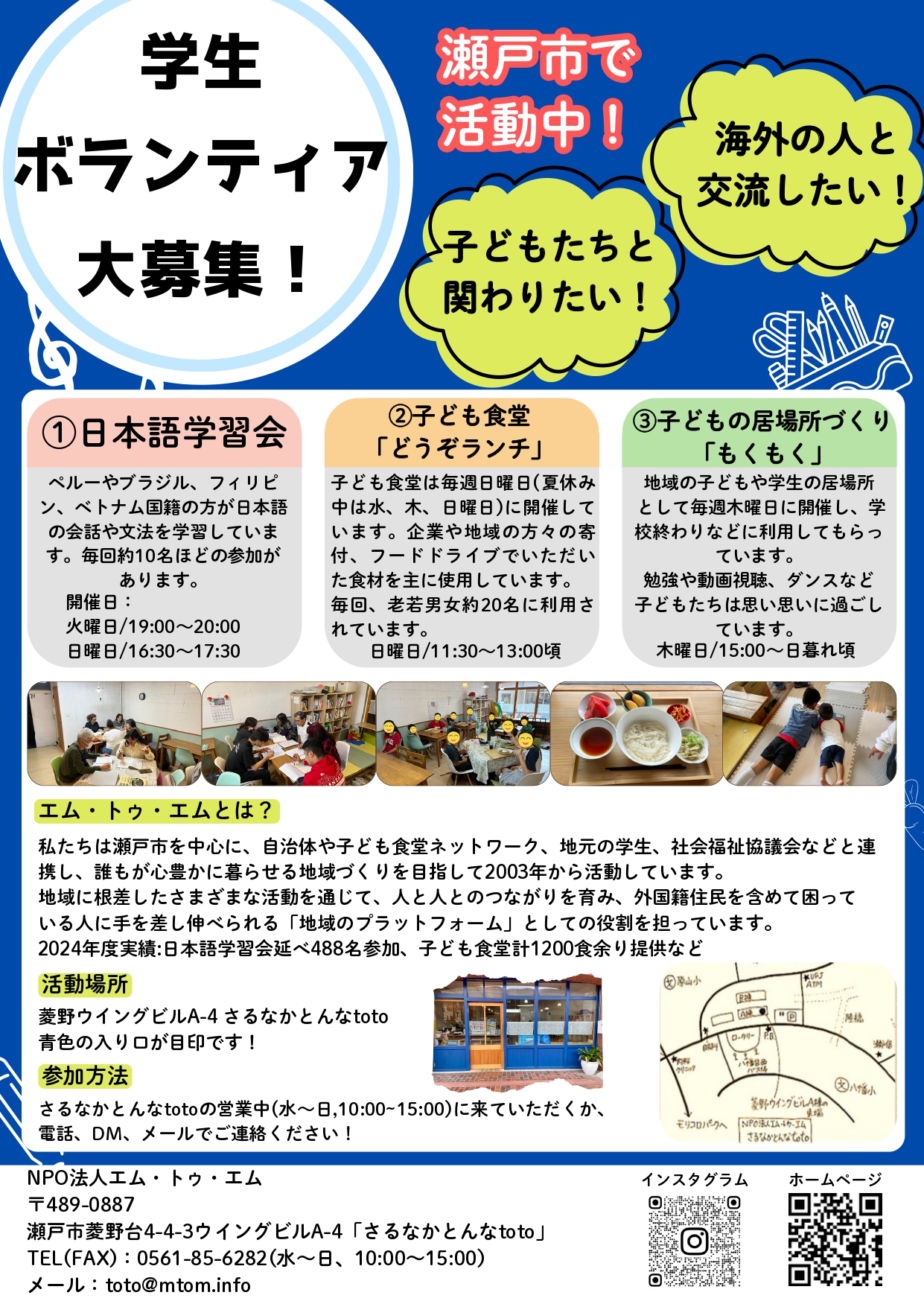 瀬戸市のNPO法人エム・トゥ・エムより学生ボランティア募集が届きましたのでお知らせいたします。