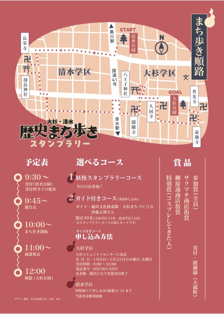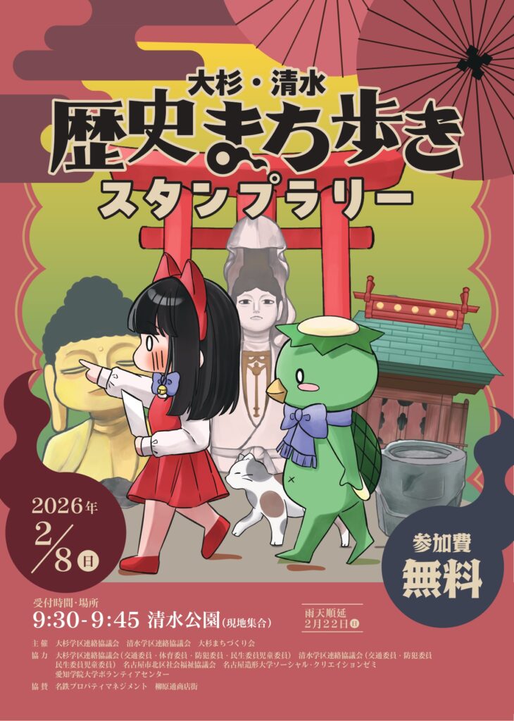 大杉・清水 歴史まち歩きスタンプラリーの学生ボランティアを募集します。 大杉学区・清水学区は、名城公園キャンパスから近い学区で、歩いて10分程度です。 「やってみよう!」の気持ちでの参加お待ちしております。