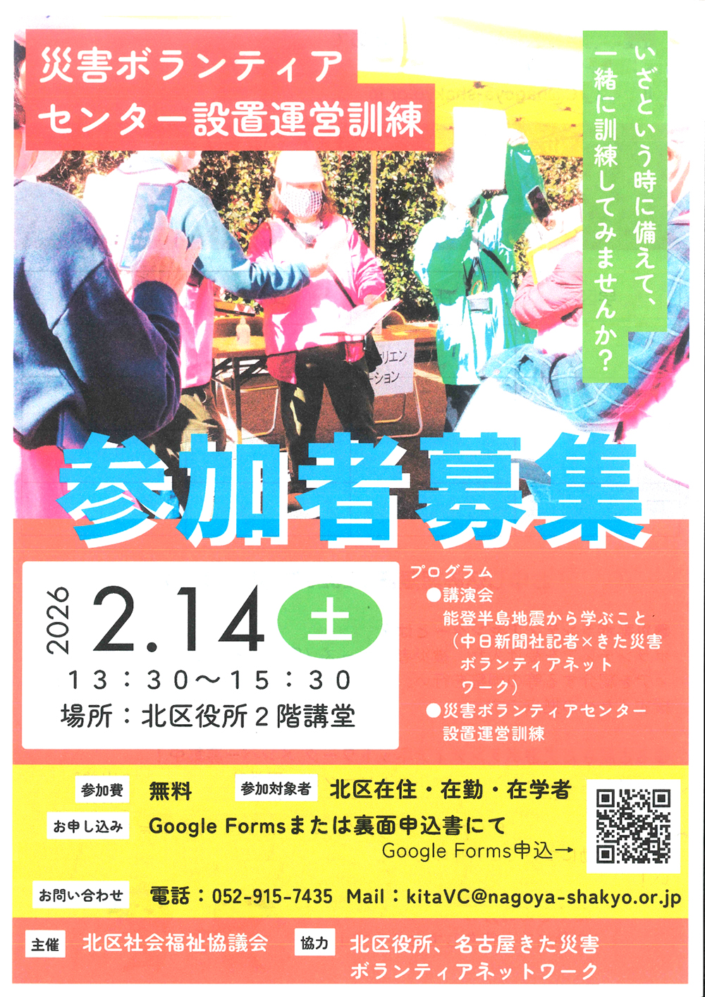 北区社会福祉協議会より「災害ボランティアセンター設置運営訓練」の参加者募集が届きましたのでお知らせします。