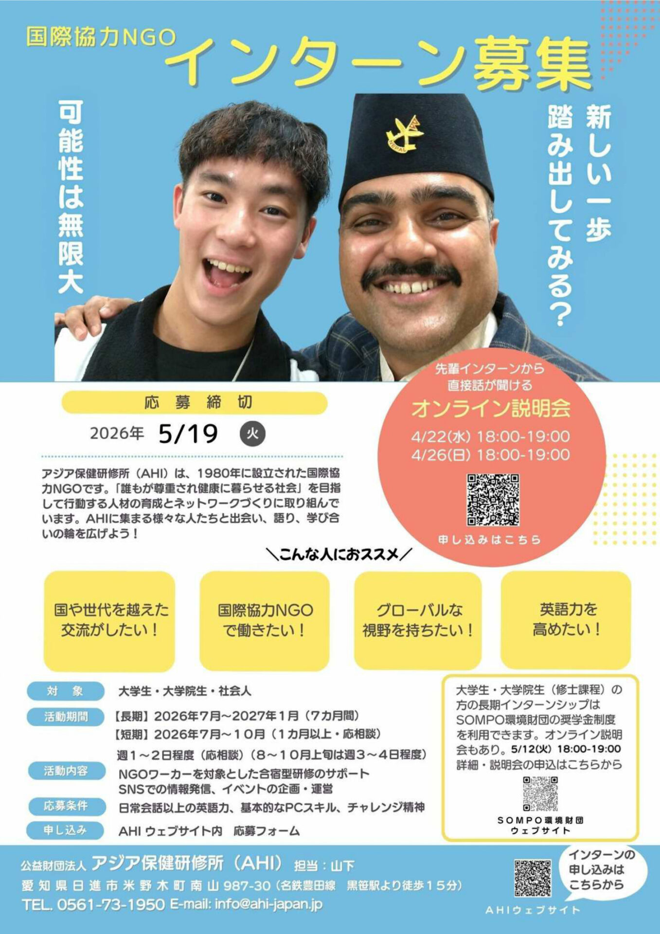 | 問合せ先 | 公益財団法人 アジア保健研修所(AHI) 愛知県日進市米野木町南山987-30 TEL : 0561-73-1950 E-mail : info@ahi-japan.jp |