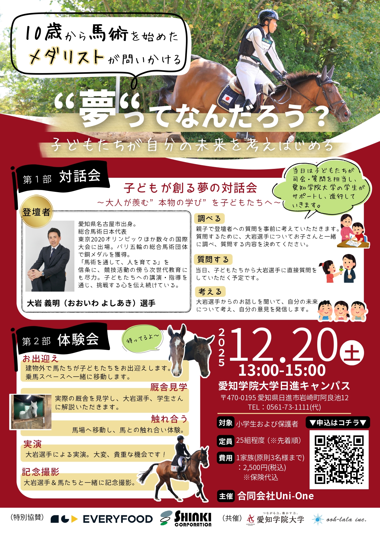 | 内容 | <第1部> 対話会 子どもが創る夢の対話会 〜大人が羨む“本物の学び”を子どもたちへ〜 ★登壇者:大岩義明選手 東京2020オリンピック・総合馬術日本代表・銅メダリスト <第2部> 体験会 厩舎見学、馬との触れ合い、大岩選手による実演、 大岩選手&馬たちと記念撮影 |