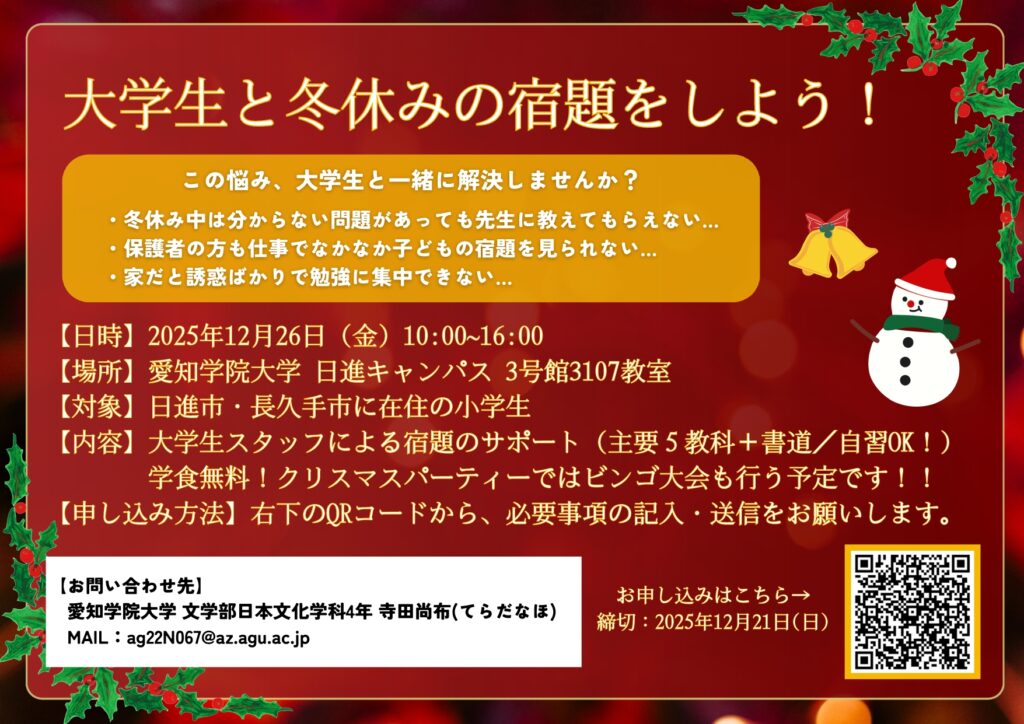 【小学生対象】「大学生と冬休みの宿題をしよう!」開催のご案内(12/26)